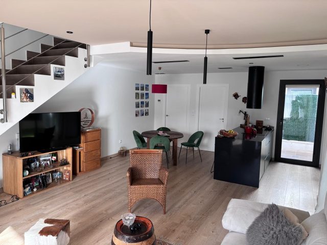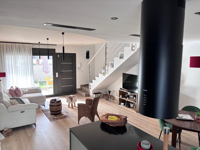 At the heart of the property, a generous and light-filled living room invites you to unwind, with an effortless flow into the open-plan kitchen—fully equipped with white goods—creating a sociable and welcoming space ideal for entertaining family and friends. Large openings allow natural sunlight to pour in throughout the day, enhancing the warm and inviting atmosphere.