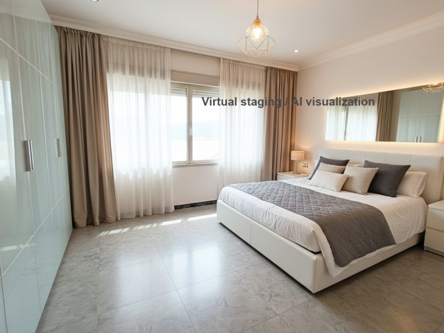 On the ground floor, you will find a living and dining room, one bedroom, a kitchen with pantry, and a bathroom. From the kitchen, there is direct access to a private patio with a barbecue area, as well as access to the garage. From the patio, stairs lead up to a sunny rooftop terrace/solarium, perfect for relaxing, entertaining, or enjoying the Mediterranean climate all year round.