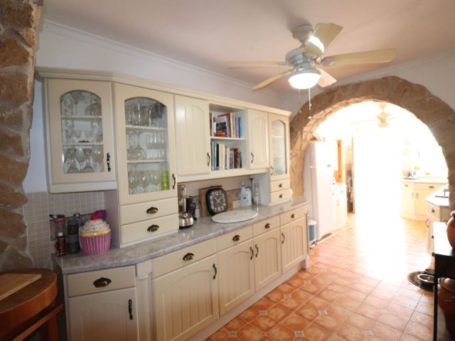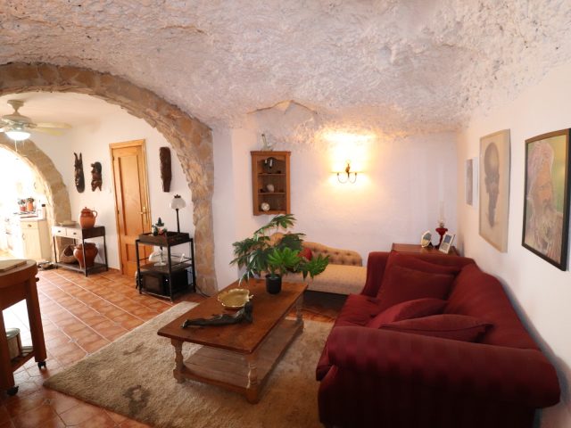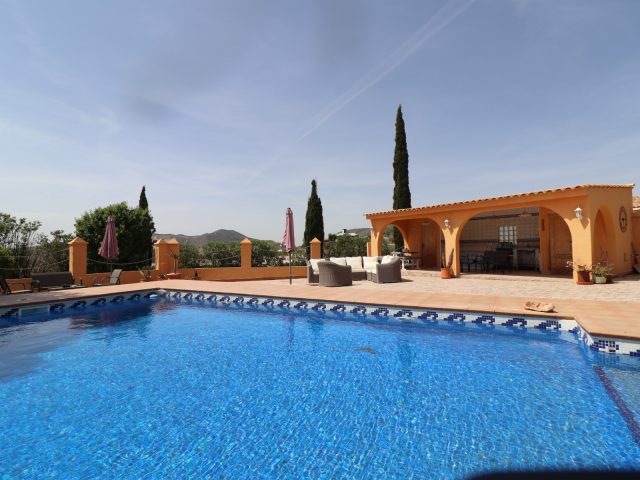 This beautiful property is located in a superb quiet location just a few minutes drive from the 2 villages of Hondon de las nieves and Hondon de los frailes with all amenities. There are more than 400m2 of built area including the main house with a part cave, a pool area with porch, summer kitchen, technical local and toilet, storage, a laundry room and a double garage with workshop that could easily be converted into a separate apartment. The main house consists of several livings,  dining room, a kitchen, a pantry and 5 bedrooms and 2 bathrooms. The rooms are in the cave, which brings charm and a lot of freshness in summer. In front of the house, the space is occupied by a covered terrace (30m2)  and a spacious terrace with barbecue area. The pool is superb and is located right in front. The house is connected to the water and electricity network, and has internet and a hot/cold air conditioning unit. It is a rare property, with a lot of charm and that must be seen to realize